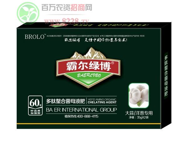 河南綠霸化工有限公司是一家集肥料科研開發、生產、銷售于一體的高科技含量的技術型公司。公司生產的“霸爾綠博”“肥太子”等品牌高端液肥,暢銷國內30多個省市。現擁有*認證的大量元素水溶肥料、中量元素水溶肥料、微量元素水溶肥料、含氨基酸水溶肥料、復合微生物肥料等高端肥料研發、生產資質。